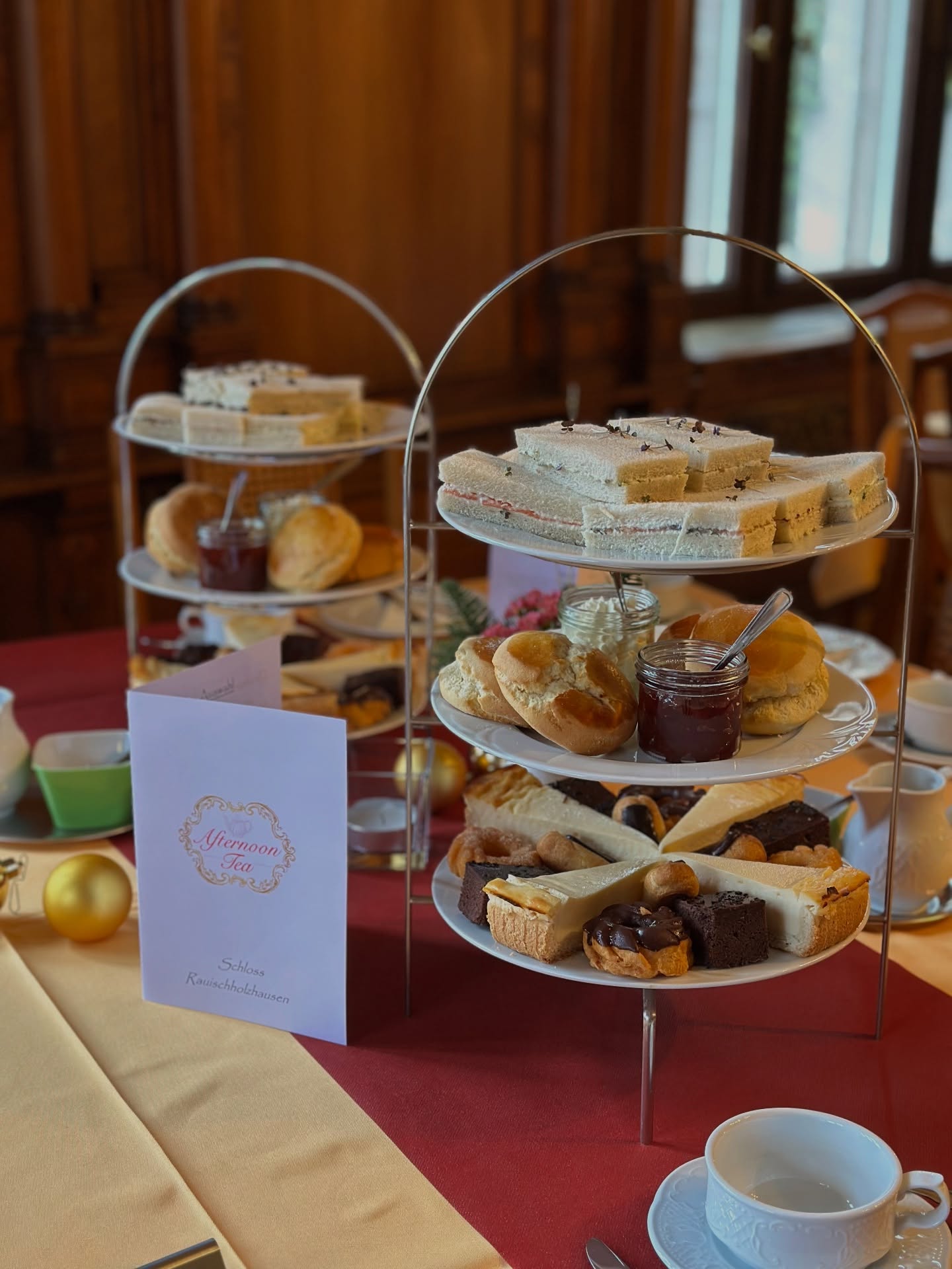Sandwiches (mit Gurke, Lachs, Frischkäse), Scones mit Mascarpone-Cream und Marmelade, sowie verschiedenen kleinen Kuchen und Gebäck sind auf Etageren angerichtet. Dazu servieren wir ein Kännchen mit englischen Teesorten.